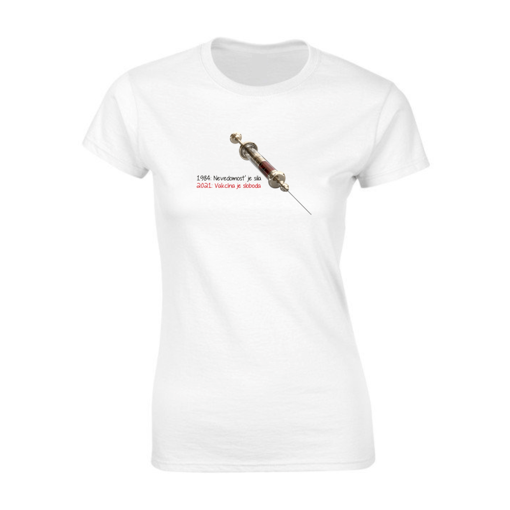 Dámske tričko s krátkym rukávom vyššej gramáže. NÁPIS 1984: Nevedomosť je sila – 2021: Vakcína je sloboda